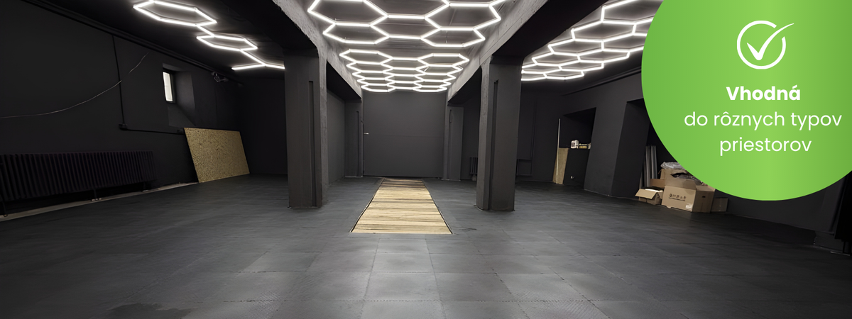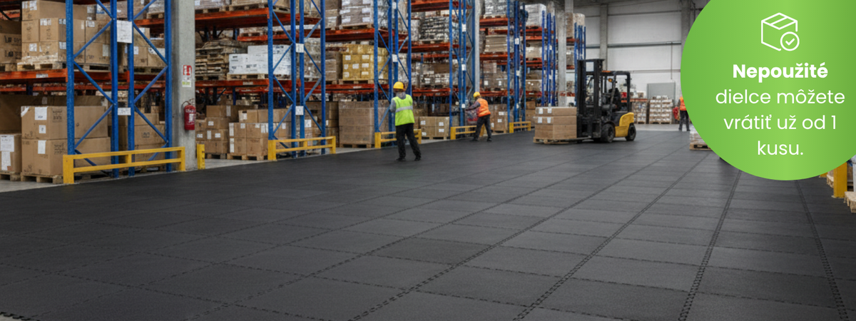 Každý diel má rozmery 50 × 50 cm, hrúbku 0,7 cm a hmotnosť približne 1,6 kg. Podlaha zvládne nosnosť až 30 ton/m², takže bez problémov unesie auto, ťažké stroje aj regály.
